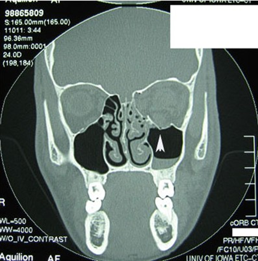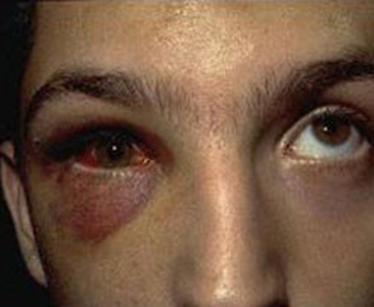 Figure 2: Bruising around the eye is a common symptom. The right eye cannot move upward like the left eye.
